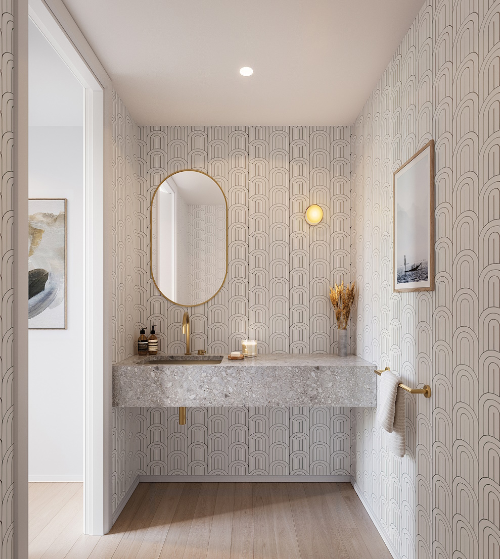 The powder room showcases a bespoke Ceppo Bianco vanity anchored by aged brass Watermark fixtures for contemporary yet timeless appeal.
