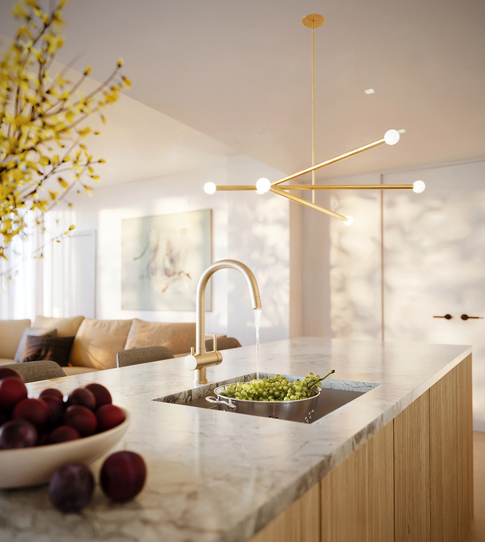 Pairing custom white oak cabinetry and serene honed marble, the luminous kitchens smartly integrate premium appliances and refined fixtures for elevated spaces to cook and entertain.