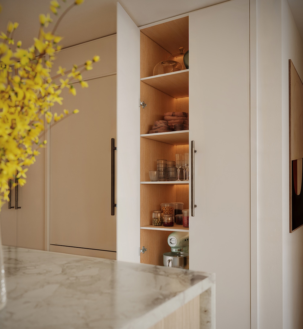 For true ease of use, each kitchen includes custom oversized pantries with ample storage that seamlessly blend into the space.